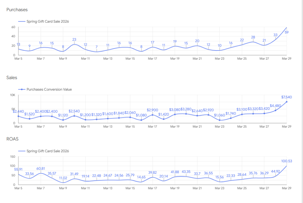 You can also see steady daily purchases throughout the campaign, with a noticeable spike toward the end of the month. This suggests that consistent messaging combined with seasonal timing helped build momentum.